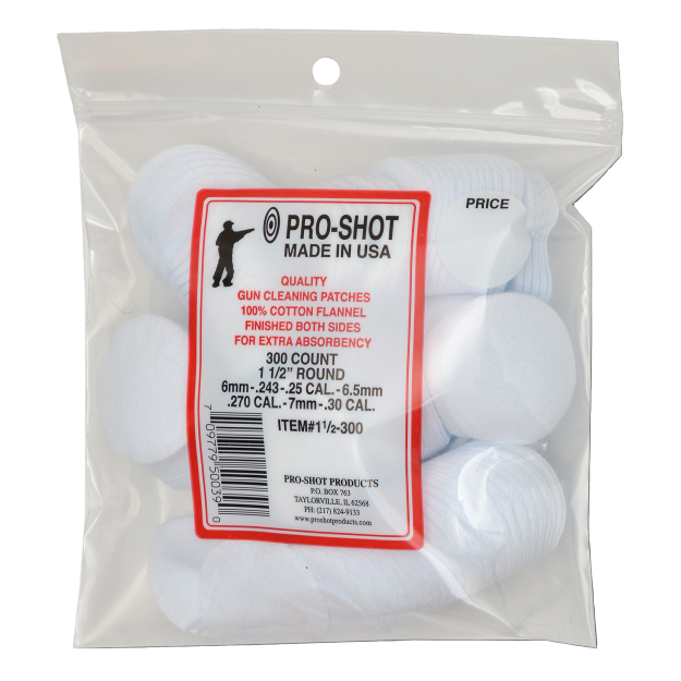 The fact is well-known that nothing surpasses 100% COTTON FLANNEL FABRIC for purposes of absorbing foreign matter and residue, and in turn carry it through the BORE with the LEAST amount of abrasive contact to the barrel’s rifling. Pro-Shot’s cleaning patches provide Maximum Cleaning Power and Barrel Protection! Clean Faster, Easier, and Protect your barrel with Pro-Shot 100% Cotton Flannel (finished both sides) Cleaning Patches!