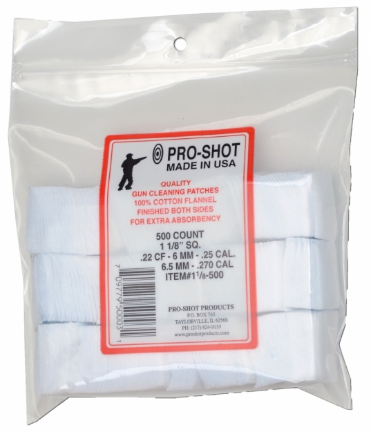 The fact is well-known that nothing surpasses 100% COTTON FLANNEL FABRIC for purposes of absorbing foreign matter and residue, and in turn carry it through the BORE with the LEAST amount of abrasive contact to the barrel’s rifling. Pro-Shot’s cleaning patches provide Maximum Cleaning Power and Barrel Protection! Clean Faster, Easier, and Protect your barrel with Pro-Shot 100% Cotton Flannel (finished both sides) Cleaning Patches!