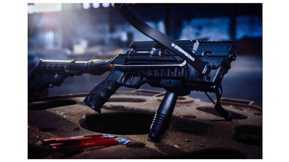 - Contains : Tactical repeating crossbow with integrated magazine, Vertical foregrip, Length-adjustable AR-15 style buttstock (with “commercial-spec” buffer tube), 6 training arrows, strings, Stringing aid