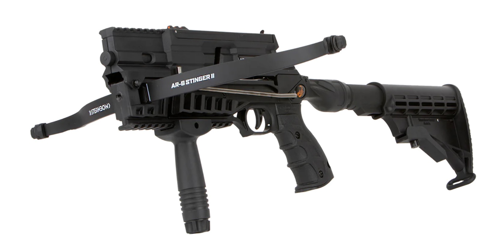- Contains : Tactical repeating crossbow with integrated magazine, Vertical foregrip, Length-adjustable AR-15 style buttstock (with “commercial-spec” buffer tube), 6 training arrows, strings, Stringing aid