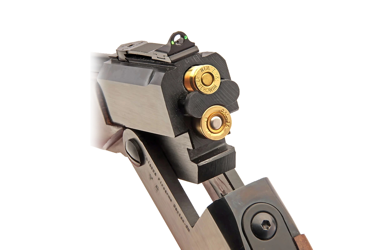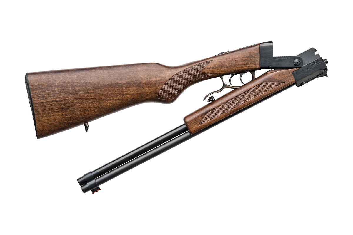 The Chiappa Double Badger is a combination rifle that shoots .22 LR and .410 GA. It is a do-all rifle, perfect for heading into the woods with if you don’t know if you’ll need the .410 or the range of a .22. It utilizes two triggers, each corresponding to one of the barrels. It folds down to the length of its barrel, a mere 19″, making it a great, compact backpack gun. It features an extractor on both chambers, a thumb safety on the tang, double triggers, and a simple lever break action connected to the trigger guard.